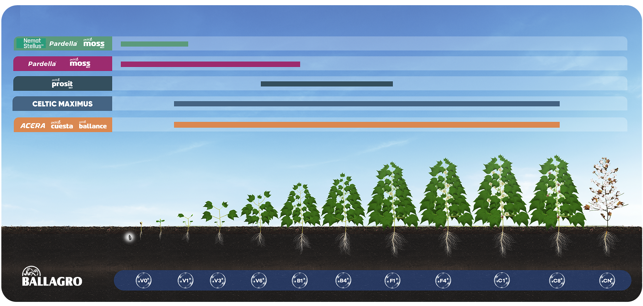 Aplicações desde o tratamento de sementes, no sulco do plantio e durante o desenvolvimento vegetativo das culturas.