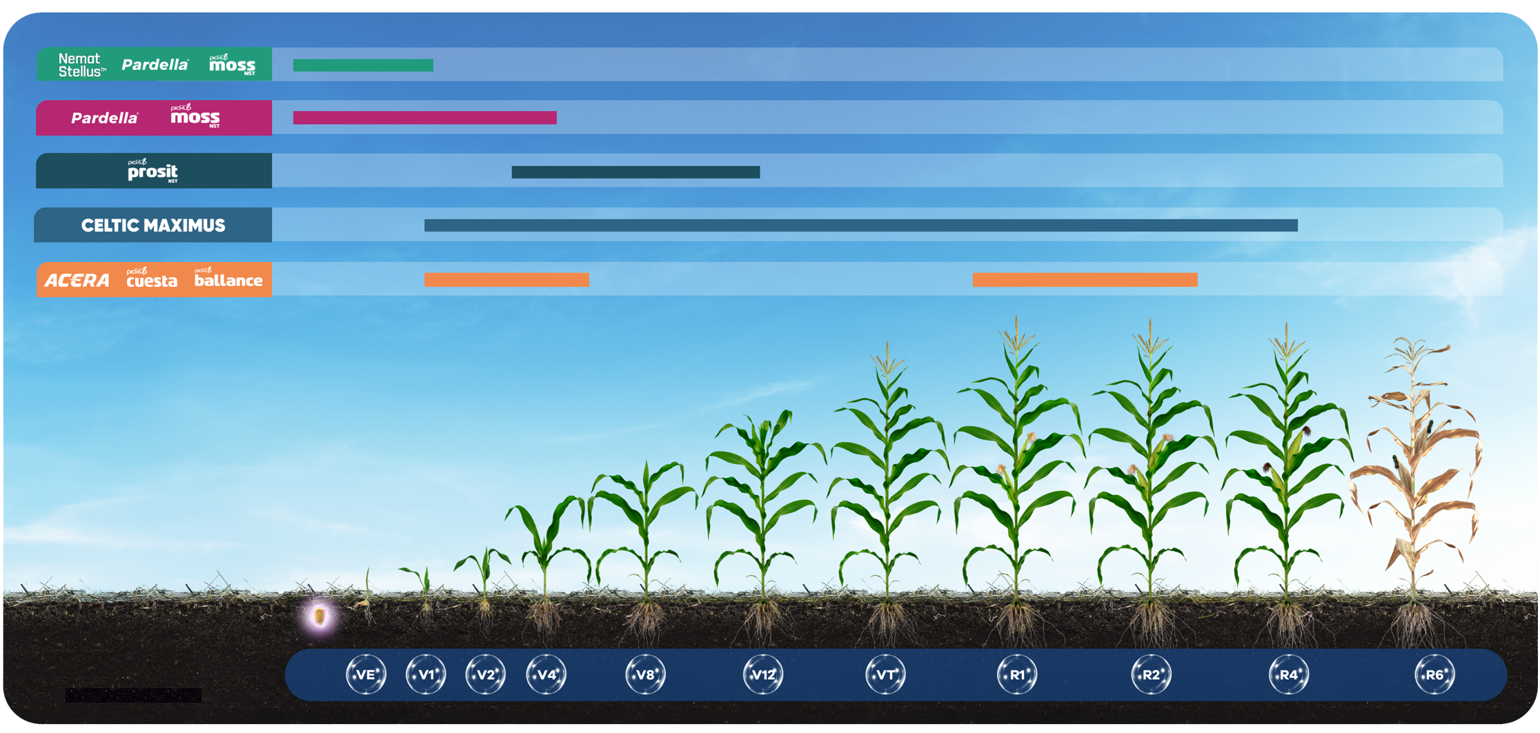 Aplicações desde o tratamento de sementes, no sulco do plantio e durante o desenvolvimento vegetativo das culturas.