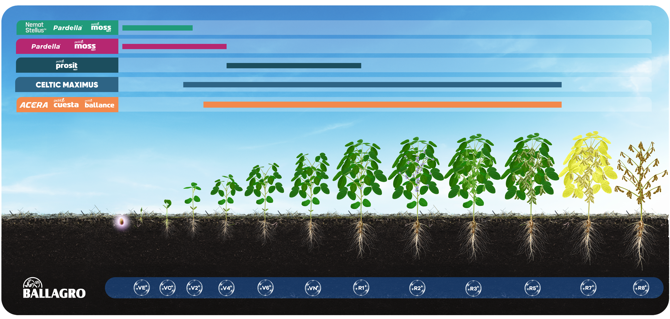 Aplicações desde o tratamento de sementes, no sulco do plantio e durante o desenvolvimento vegetativo das culturas.