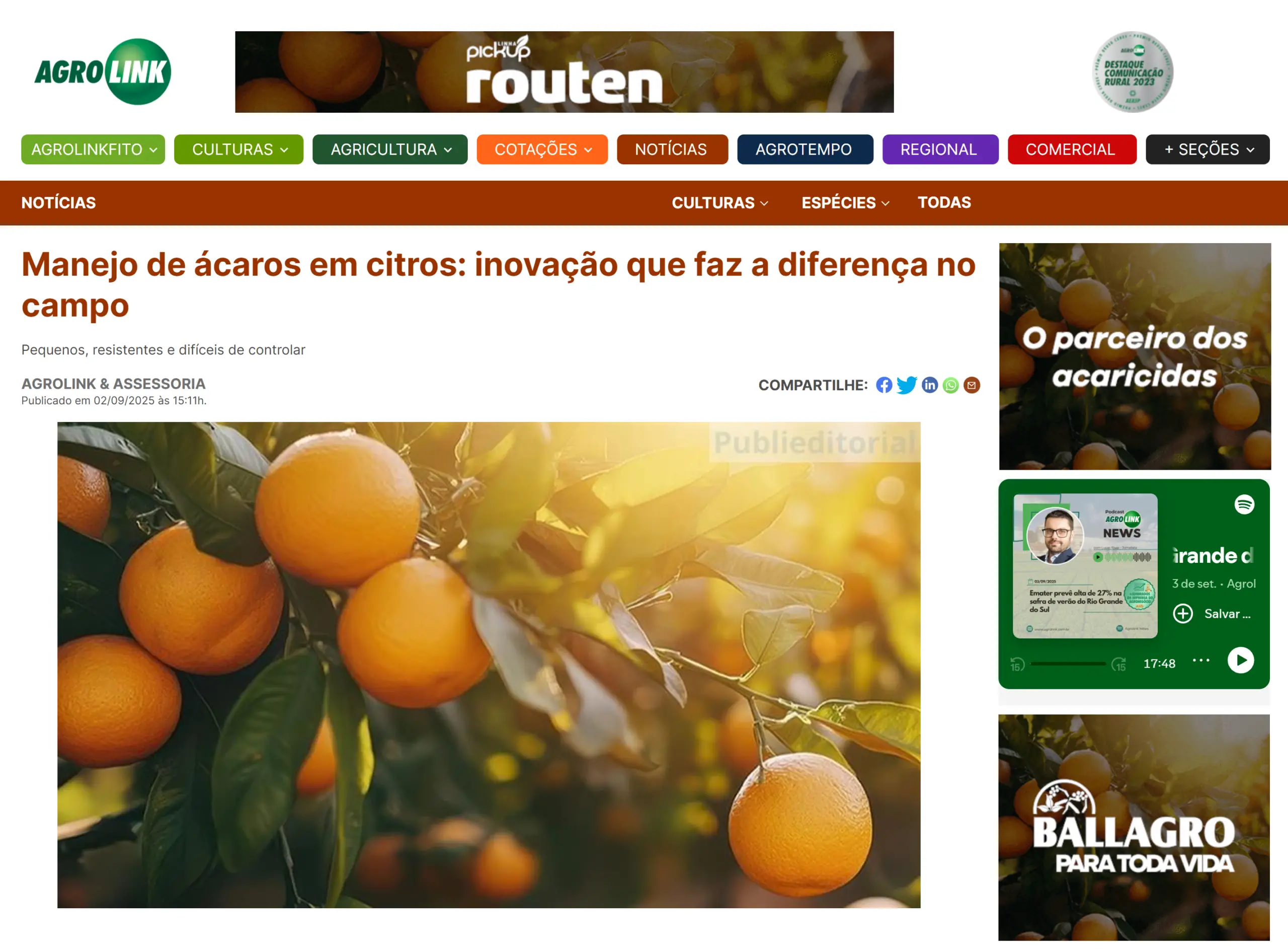 Com o Pick Up Routen, o citricultor não depende apenas do acaricida. Ele conta com um aliado que fortalece o manejo, tornando os resultados mais consistentes e protegendo a cultura de forma inteligente.